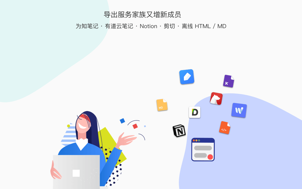 + - 导出到生产力工具,包括:`坚果云` `语雀` `有道云笔记` `为知笔记` `Dropbox` `Notion` `Onenote` `Google Drive` `印象笔记 / Evernote`,详细请看 [导出到生产力](http://ksria.com/simpread/docs/#/导出到生产力工具)